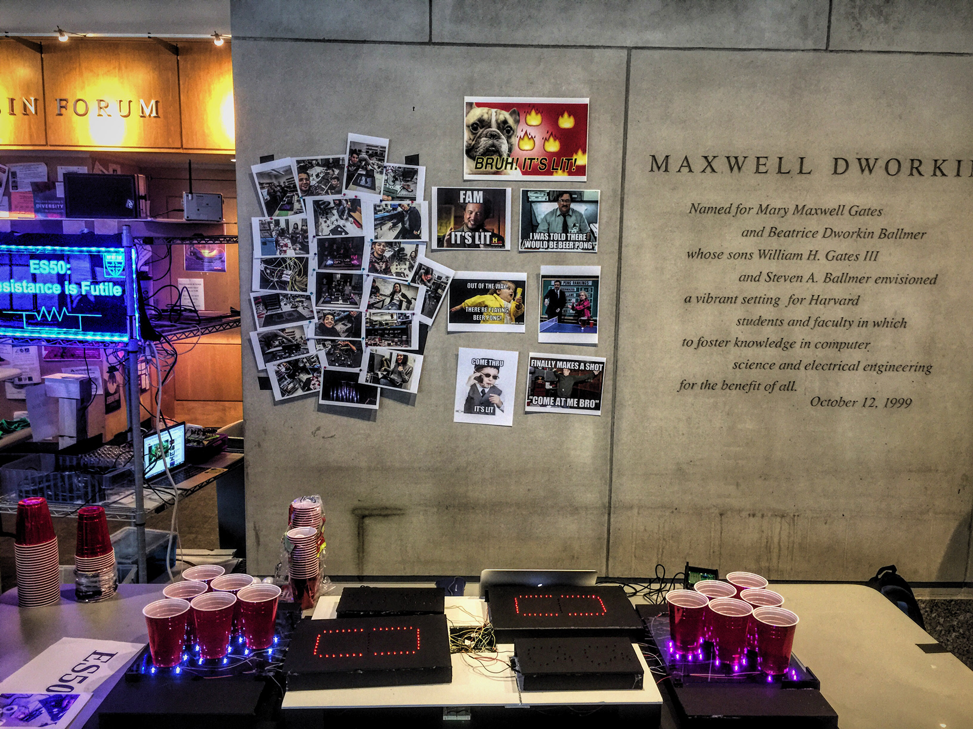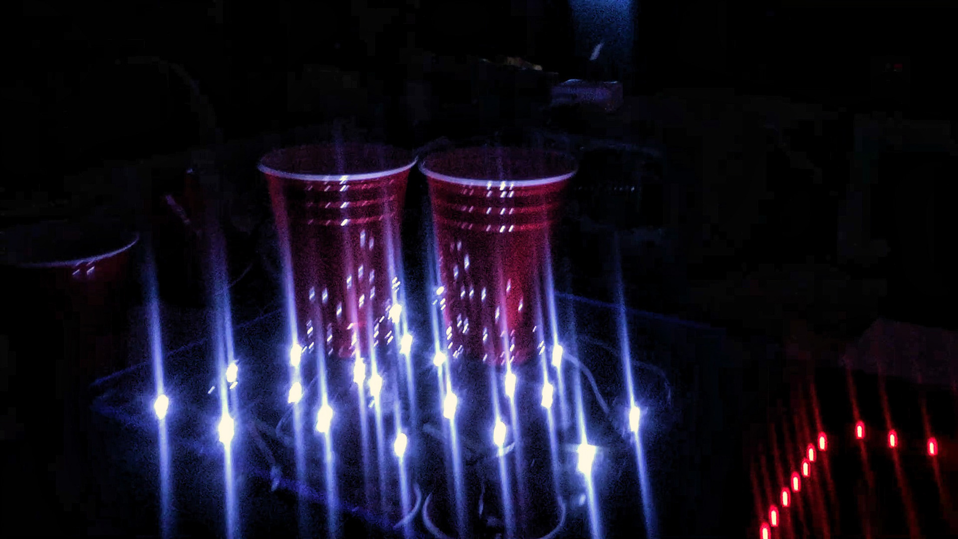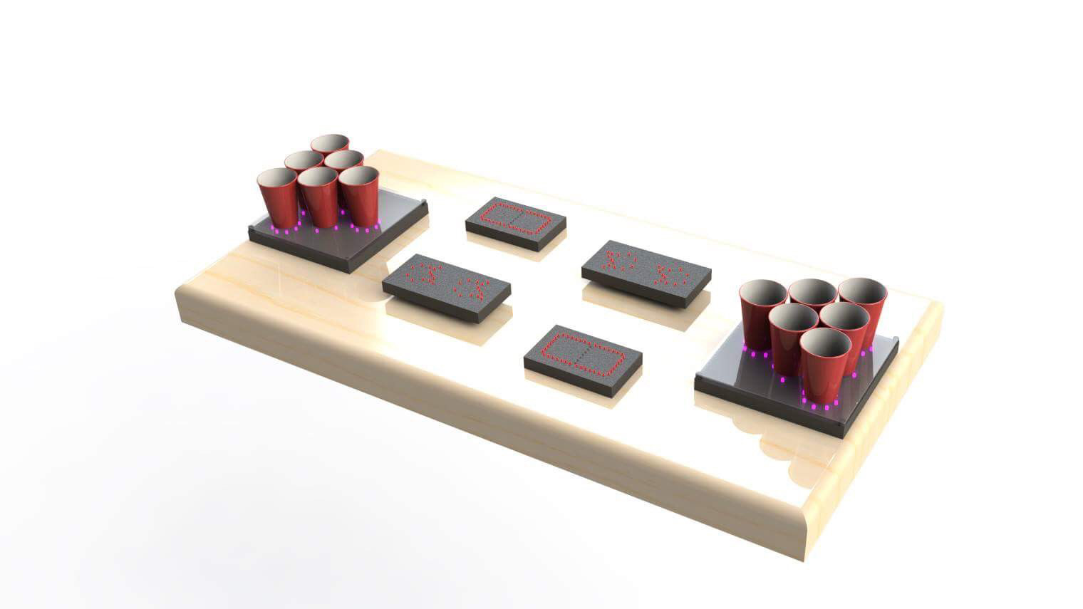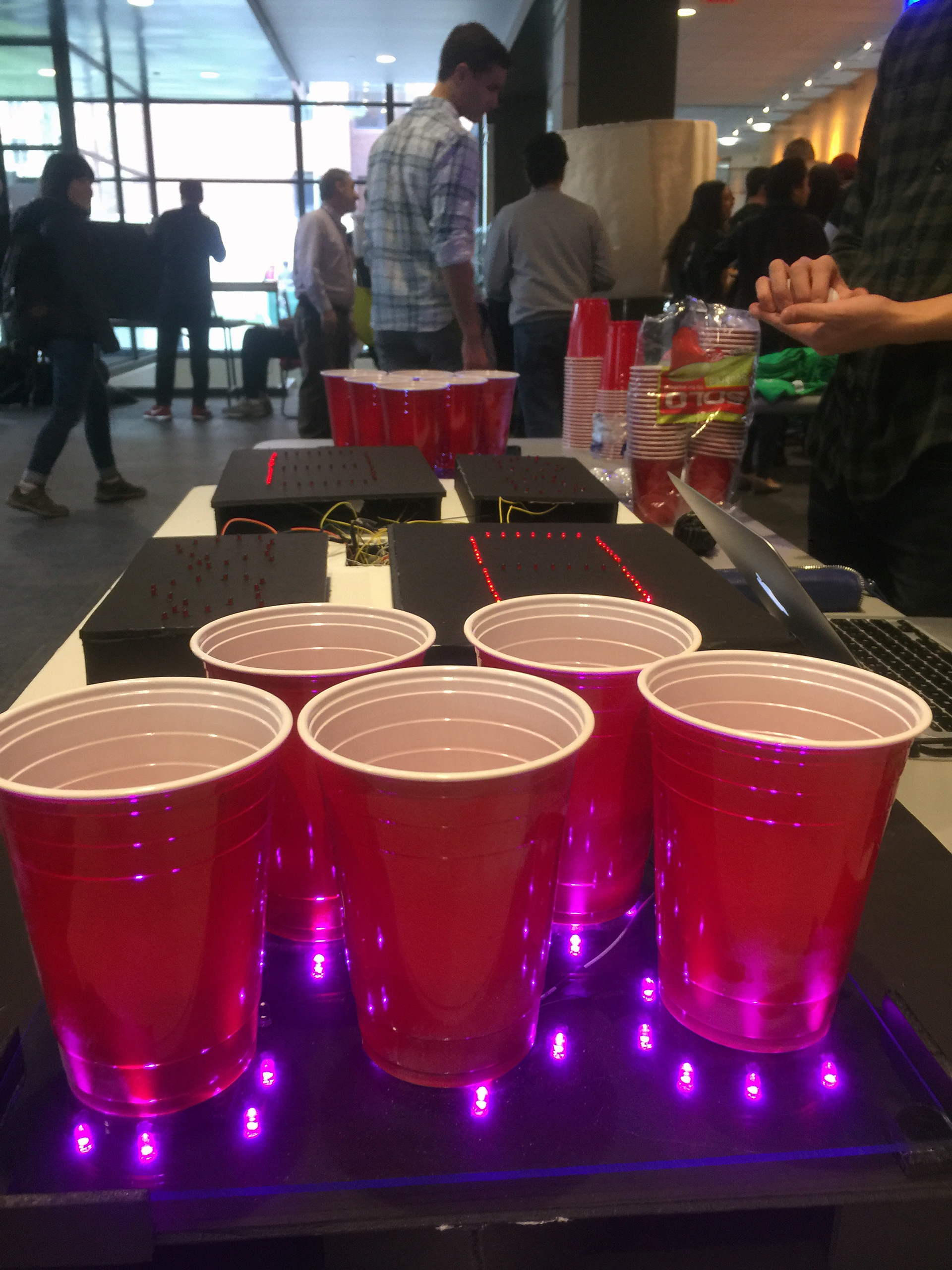 For an electrical engineering project, this interactive pong table was created to maximize a party's atmosphere. The table does so by displaying and automatically updating each player's score. The table functions with the expectation that, after a ball lands in a cup, the player will remove the cup to drink its contents; therefore, a pressure sensor under the cup will now read a pressure of 0. The table continuously counts the number of cups on each side with a pressure of 0 and displays the count as the opponent's score. When the pressure of a cup is 0, the LEDs surrounding it will also turn off. Similarly, whenever a player reaches six points, the game ends and all the lights on the table will flash. At any point through the game, a player can push down on the reset cup (cup 1 on player 1's side) to reset or to re-rack the game.